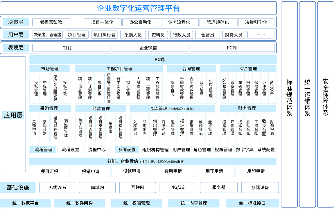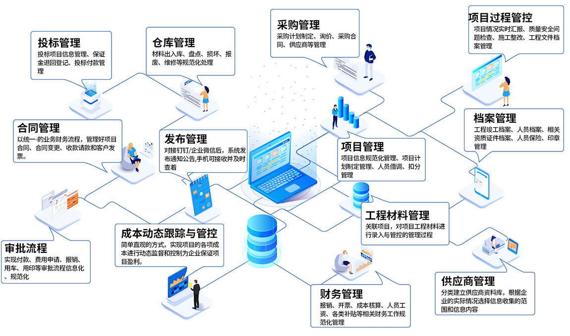 數(shù)字化管理系統(tǒng)對(duì)企業(yè)工程項(xiàng)目從項(xiàng)目投標(biāo)中標(biāo)、項(xiàng)目過(guò)程管理、合同管理、物資設(shè)備管理、采購(gòu)管理、項(xiàng)目過(guò)程管理、施工隊(duì)管理、供應(yīng)商、成本核算等進(jìn)行全面綜合管理;縱向貫穿投標(biāo)、采購(gòu)、施工、竣工的全過(guò)程,橫向涉及公司內(nèi)部的各相關(guān)崗位,是一套全方位、集成的企業(yè)項(xiàng)目綜合管理平臺(tái)。通過(guò)對(duì)成本、進(jìn)度、質(zhì)量、安全等方面的控制,以及對(duì)合同、結(jié)算、支付、資金等要素的管理,來(lái)提高工程類(lèi)企業(yè)對(duì)工程項(xiàng)目的綜合配套能力。